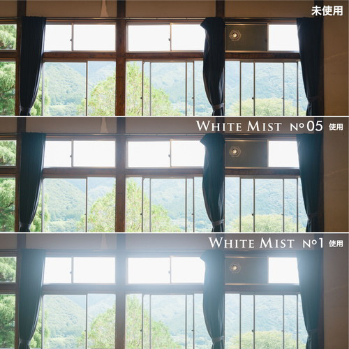 ホワイトミストNo.05は、ホワイトミストNo.1の半分のソフト効果。05(ゼロゴ)は0.5の意味です。非常に弱いソフト効果なので、逆光撮影でほどよい拡散効果が得られます。スキントーンを柔らかくする効果があり、ポートレート撮影の常用フィルターとしておすすめです。
