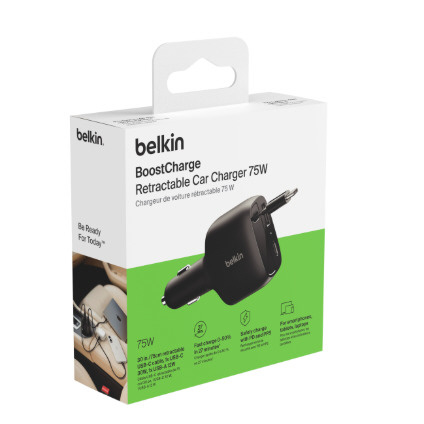 BoostCharge 75W 3ポート車載充電器USB-C巻き取り式ケーブル付き / USB-C + USB-A / PD対応 CCC001fqBK CCC001fqBK
