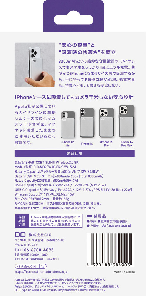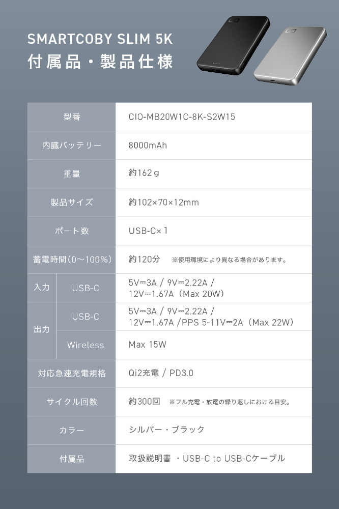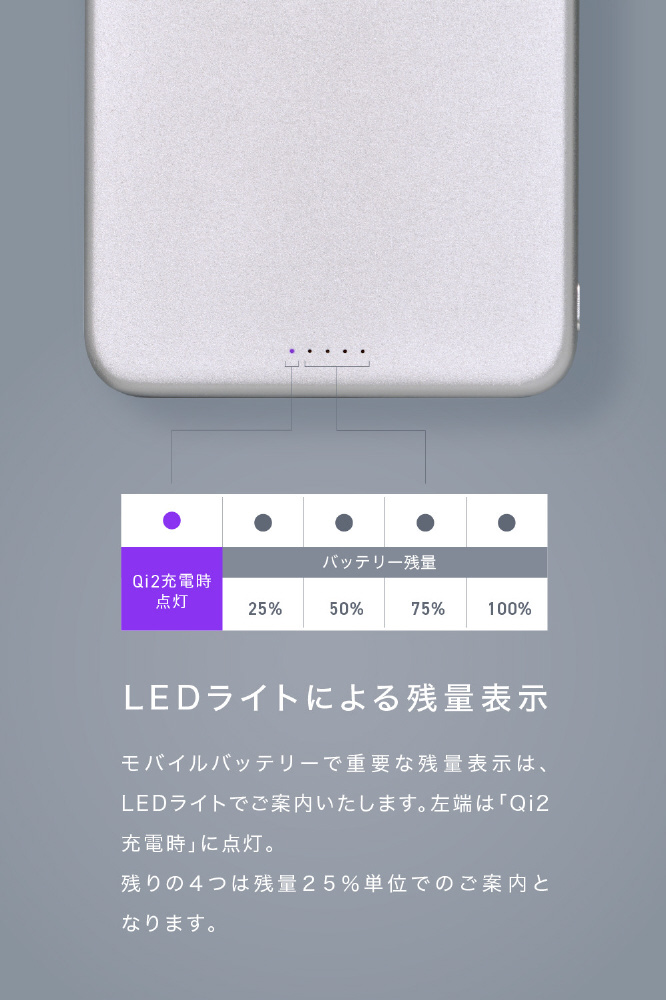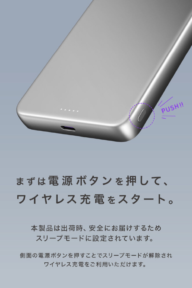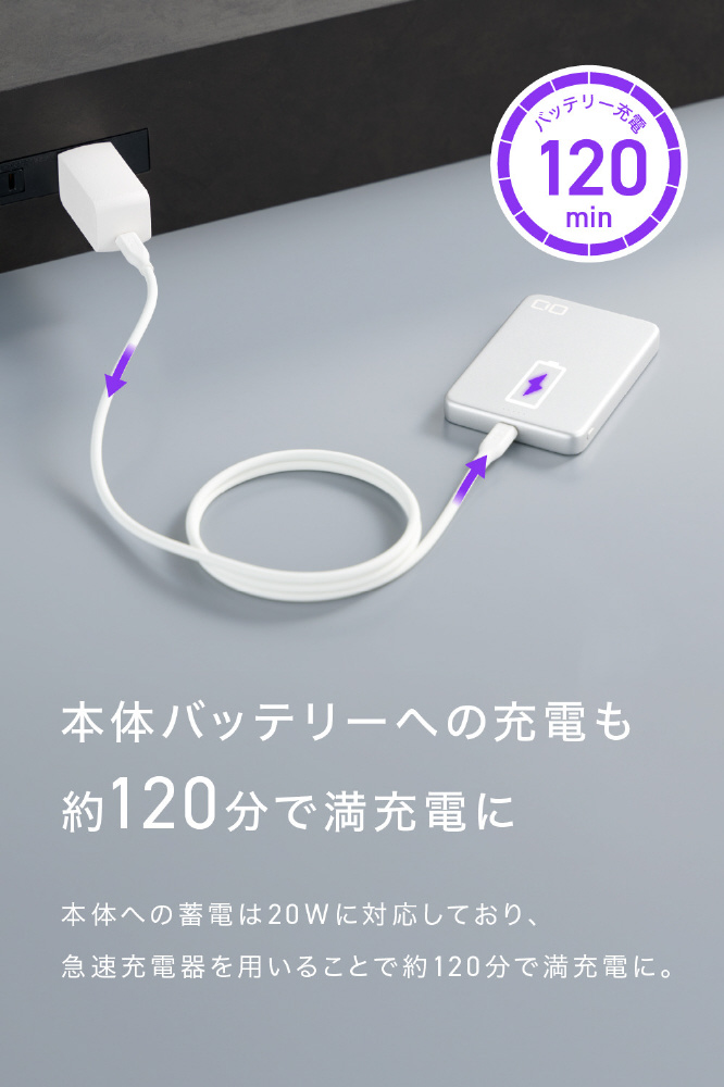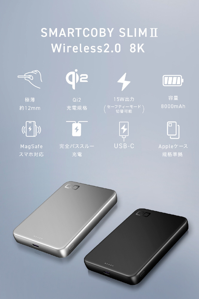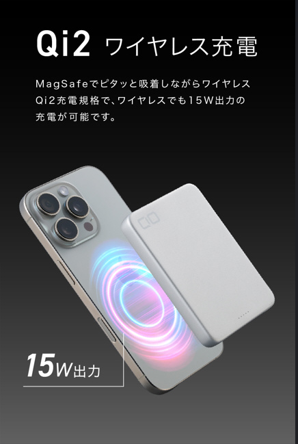 Qi2充電対応。くっつけるだけで充電できる便利さ。そして8000mAhとは思えない薄さ。 スマホ1回分の充電も可能。