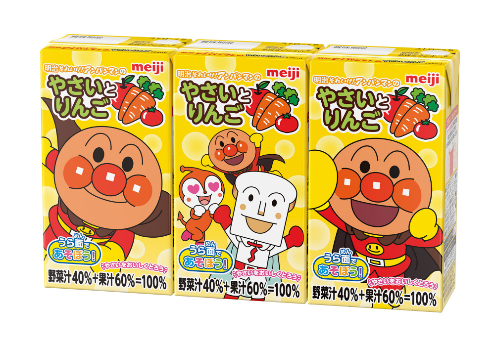 野菜汁を果汁の甘さで子供が飲みやすいあじわいに仕上げた果実と野菜の100%ミックスジュース なので、親が子供に安心して与えることができる「明治それいけ!アンパンマンのやさいとりん ご」。