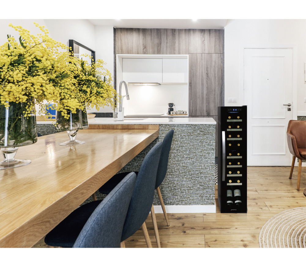 横幅わずか290mmのスリムボディですので据付場所を選びません。上下室ともにワインに適切な5 ~ 20℃の温度帯でそれぞれ設定可能な上下室完全独立制御。静粛性に定評のある当社上位機種 と同型コンプレッサを採用、庫内は多くのブルゴーニュタイプのボトルも収納可能な棚ピッチ90mmを確保しています。ボトルを魅せる斜斜め置きにも対応。
