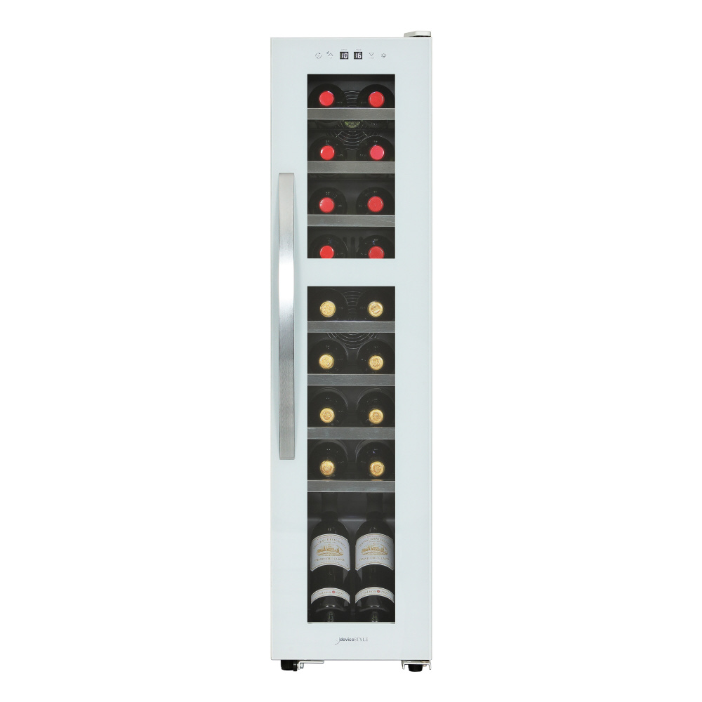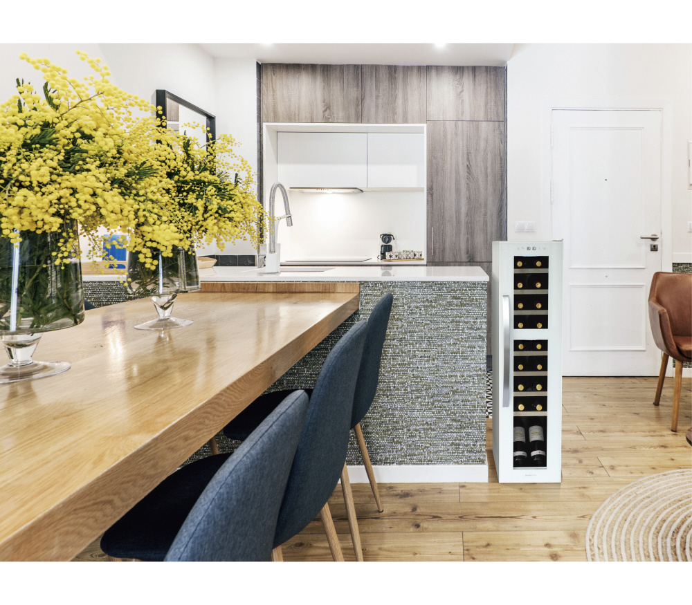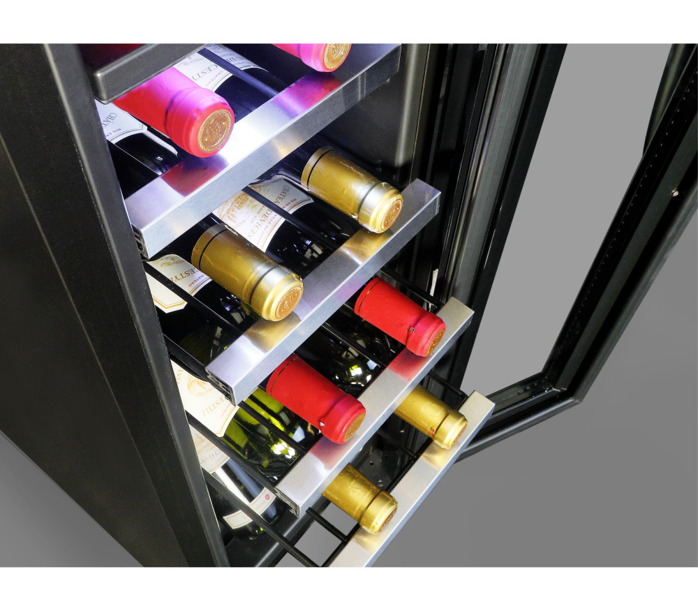 横幅わずか290mmのスリムボディですので据付場所を選びません。上下室ともにワインに適切な5 ~ 20℃の温度帯でそれぞれ設定可能な上下室完全独立制御。静粛性に定評のある当社上位機種 と同型コンプレッサを採用、庫内は多くのブルゴーニュタイプのボトルも収納可能な棚ピッチ90mmを確保しています。ボトルを魅せる斜斜め置きにも対応。