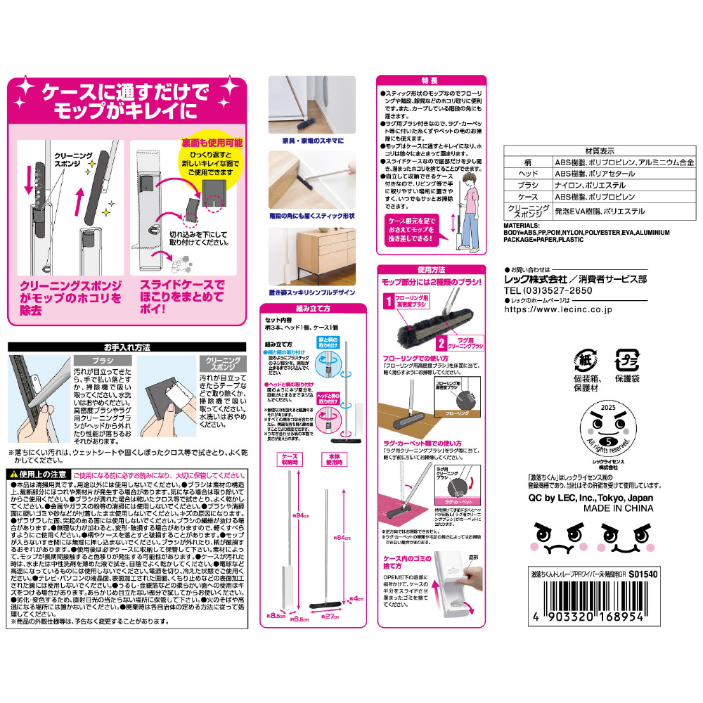 くり返し使えるホコリ取り 高密度ブラシ ラグ・カーペットの糸くず・ペットの毛にも ●スティック形状のモップなのでフローリングや階段、隙間などのホコリ取りに便利です。また、カーブしている階段の角にも届きます。 ●ラグ用ブラシ付きなので、ラグ・カーペット等に付いた糸くずやペットの毛のお掃除にも使えます。 ●モップはケースに通すとキレイになり、ホコリは徐々にまとまって溜まります。