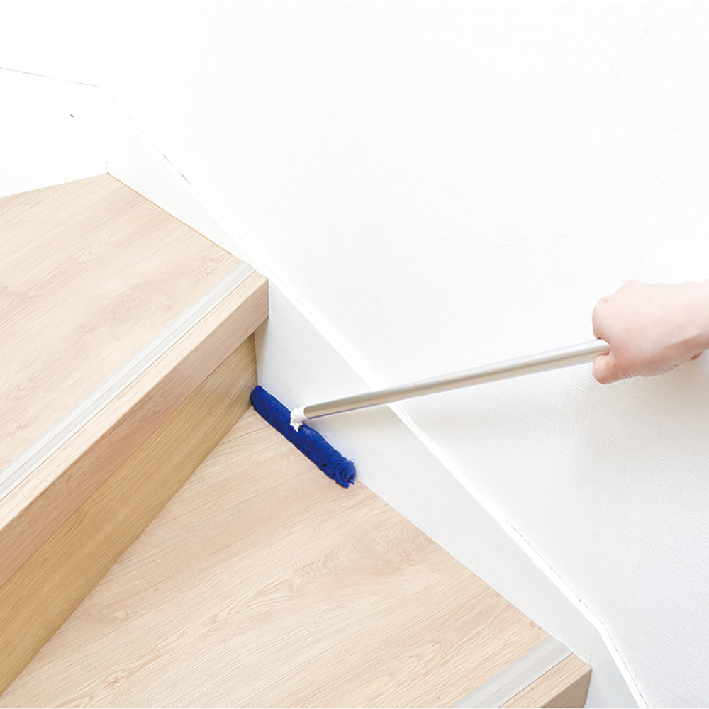 ●スティック形状のモップなのでフローリングや階段、隙間などのホコリ取りに便利です。また、カーブしている階段の角にも届きます。