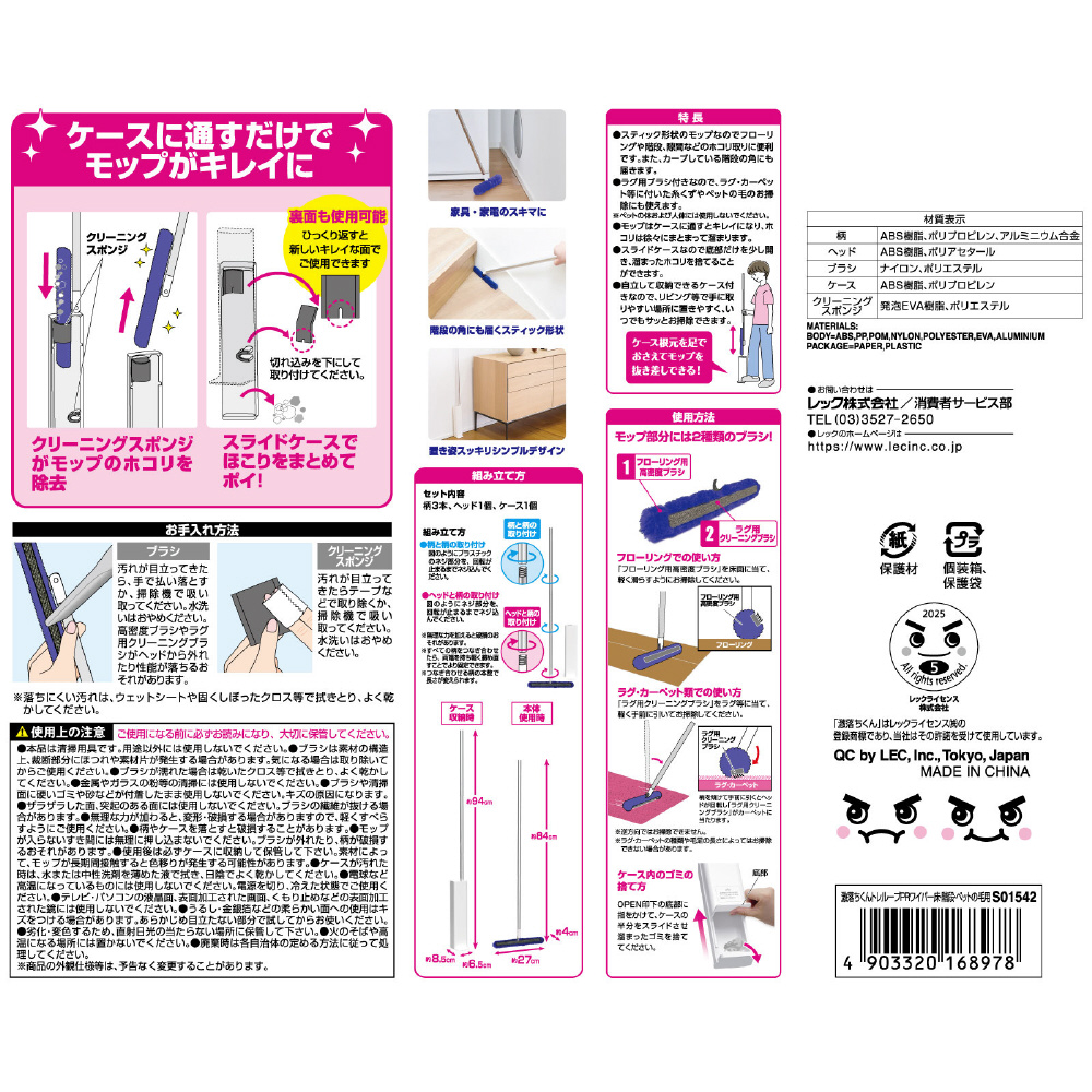 くり返し使えるホコリ取り 高密度ブラシ ラグ・カーペットのペットの毛にも! ペットの毛やホコリもスッキリ!! ●スティック形状のモップなのでフローリングや階段、隙間などのホコリ取りに便利です。また、カーブしている階段の角にも届きます。 ●ラグ用ブラシ付きなので、ラグ・カーペット等に付いた糸くずやペットの毛のお掃除にも使えます。 ※ペットの体および人体には使用しないでください。
