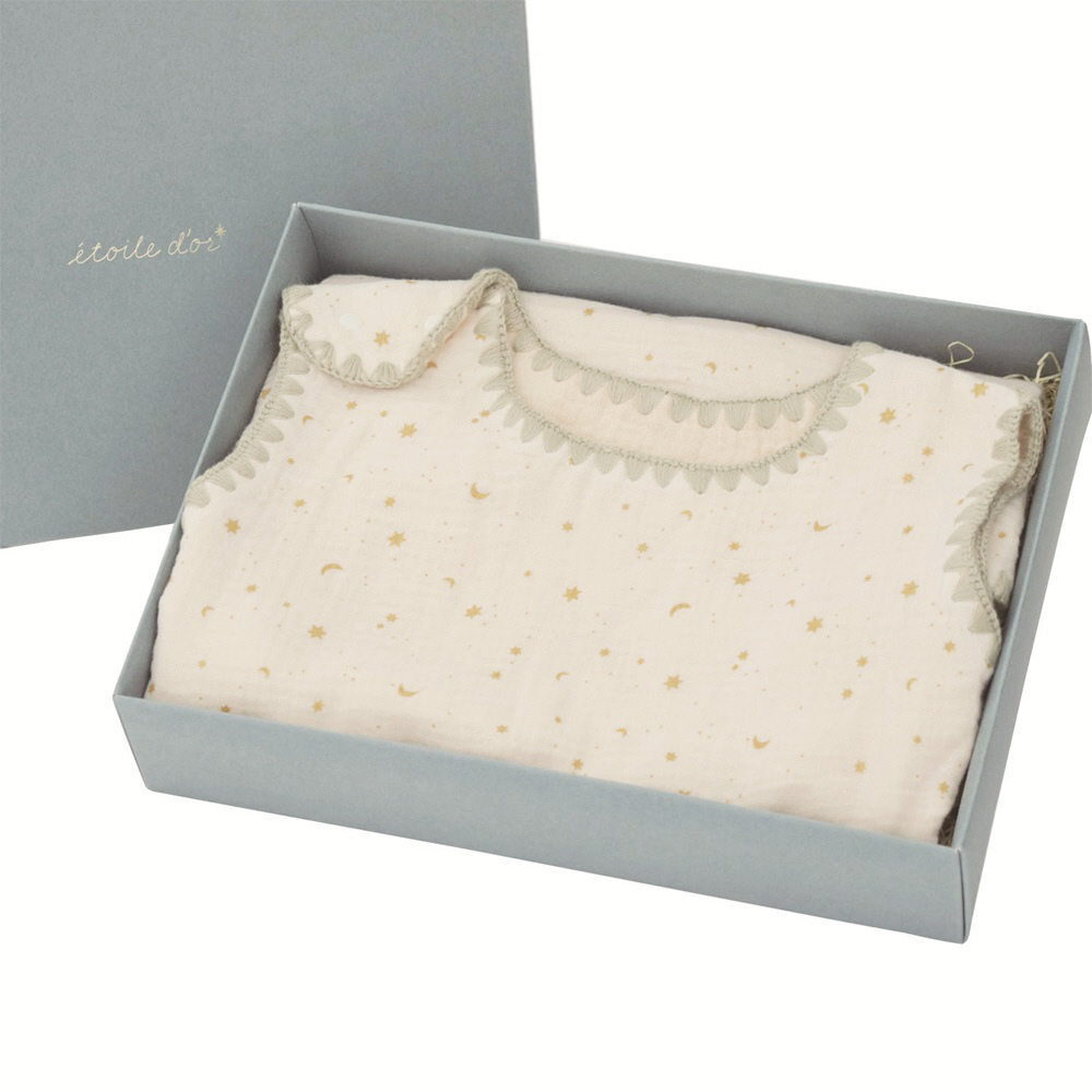 全体に施された箔押しプリントがさりげない華やかさを演出。温かみのあるブランケットステッチがアクセントになっています。ギフトボックス入り。
