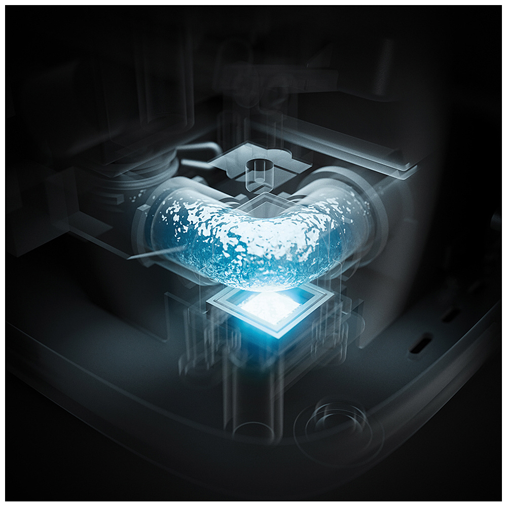・衛生的な加湿にこだわりました。UVライト技術により、水はミスト化される前に自動で消毒され、常に衛生的で安心な加湿を実現します。UVライトは本体の内のアクセスできない場所に安全に設置されており、自動的に作動し、メンテナンスは必要ありません。