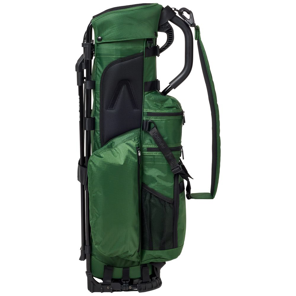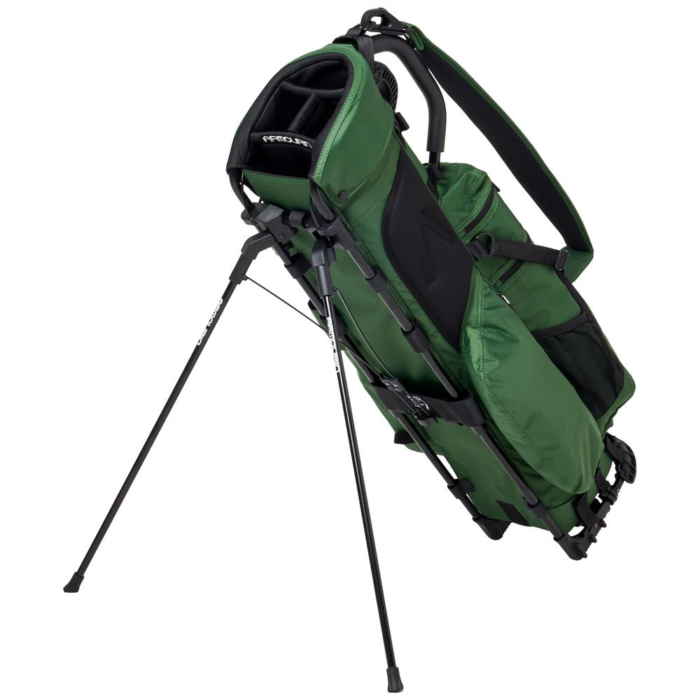 従来のプッシュ式スタンドキャディバッグの不便さを解消するワンタッチ式スタンド。