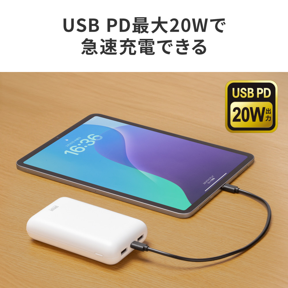 ●USB Power Delivery(USB PD)規格による最大20Wの出力に対応し、対応スマートフォンやタブレットなどへ急速充電ができるモバイルバッテリーです。