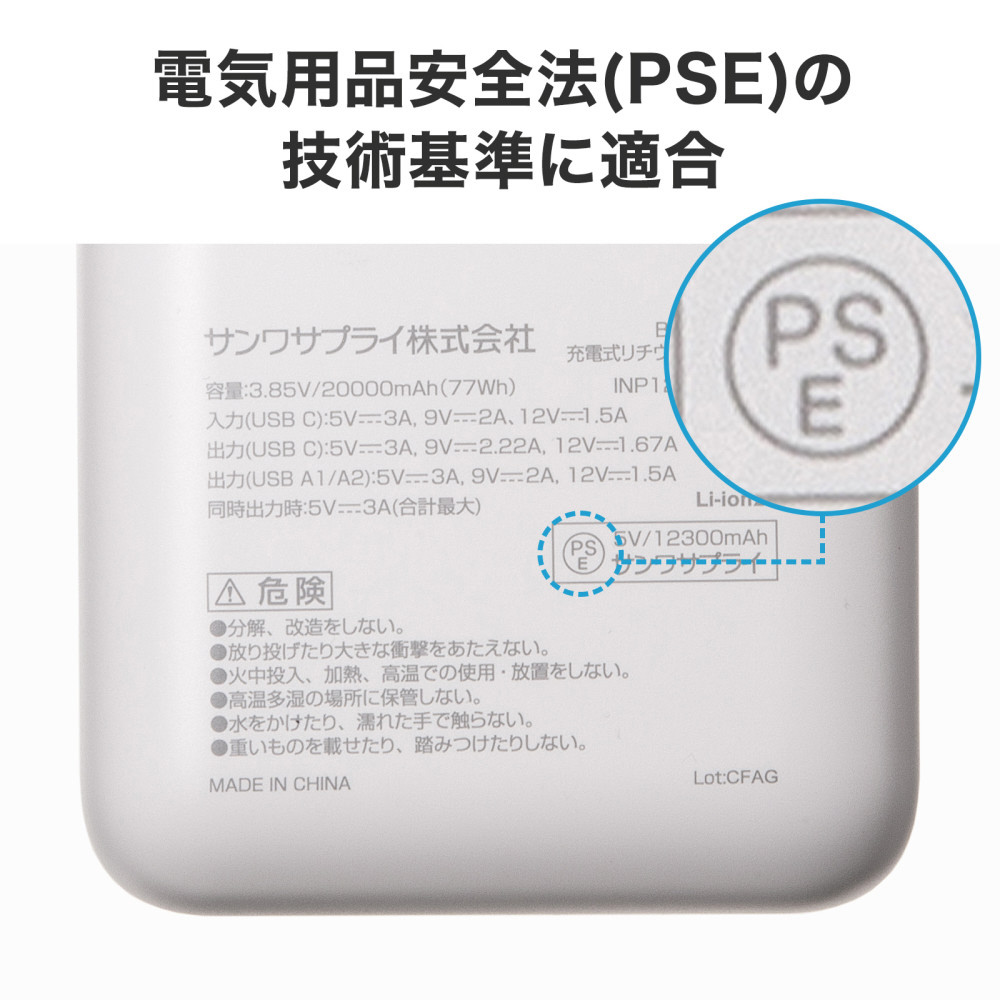 ●電気用品安全法(PSE)の技術基準に適合した安全性の高いモバイルバッテリーです。