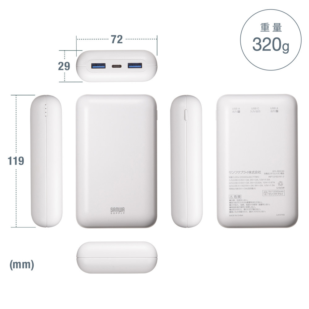 モバイルバッテリー PSE記述基準適合 USB-C入力/出力 USB A出力 充電USB-Cケーブル付属(20000mAh・PD20W) BTL-RDC39