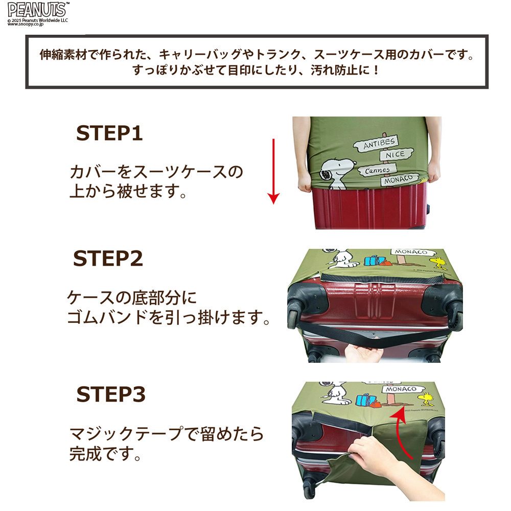 大切なスーツケースをスヌーピーデザインで可愛く守るカバー。