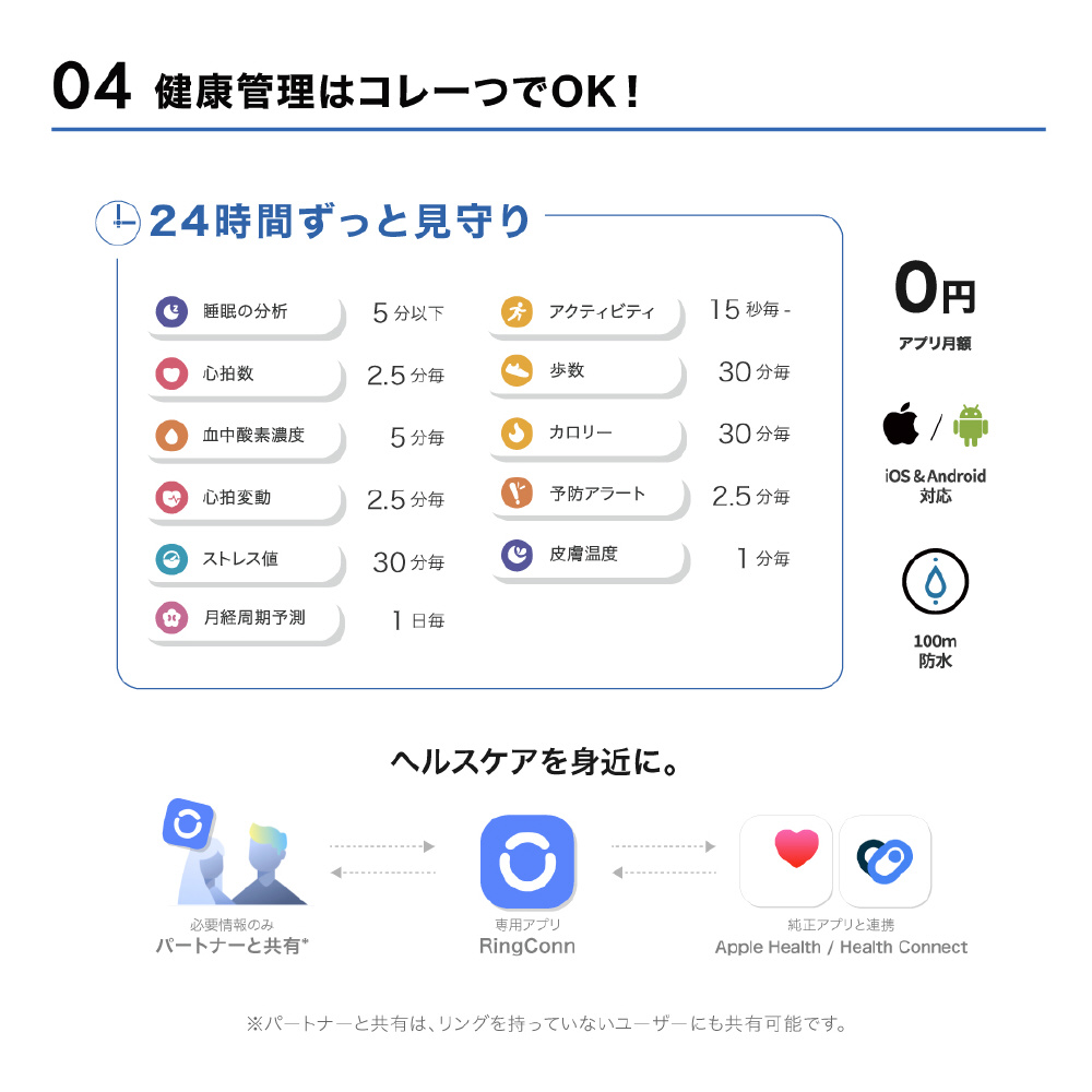 AIスマートリング RingConn Gen2 Series から「Gen2Air」 が登場。わずか2.5gの軽量デザインで、アクセサリー感覚で自然に着けられるため、仕事でもプライベートでも違和感なく日常に溶け込みます。高精度センサーにより、24時間体制で心拍数(HR)、心拍変動(HRV)、および血中酸素飽和度(SpO2)を2.5分ごとに追跡し、睡眠の質やストレス状態をやさしくモニタリング。専用アプリではデータが直感的に表示され、AIチャットがあなたの生活リズムを整えるヒントを提案。バッテリーは最長10日間持続し、毎日の充電ストレスも軽減。おしゃれを妨げないシンプルで洗練されたデザインは、ギフトにも最適です。