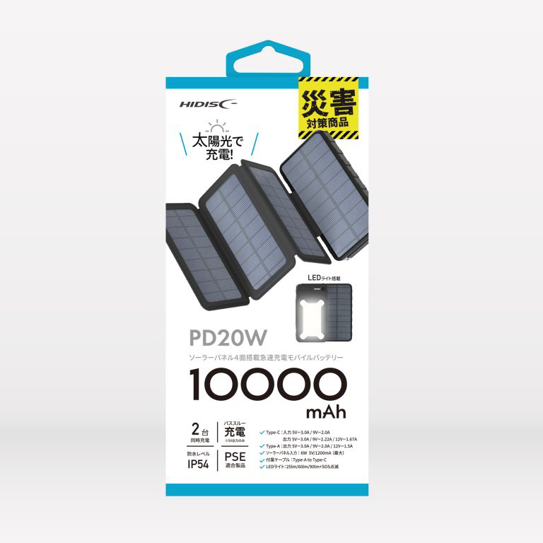 HIDISC ソーラーパネル4面搭載 10000mAhモバイルバッテリー HD4-MBTCD20WSP4L10BK [USB Power Delivery対応 /2ポート]