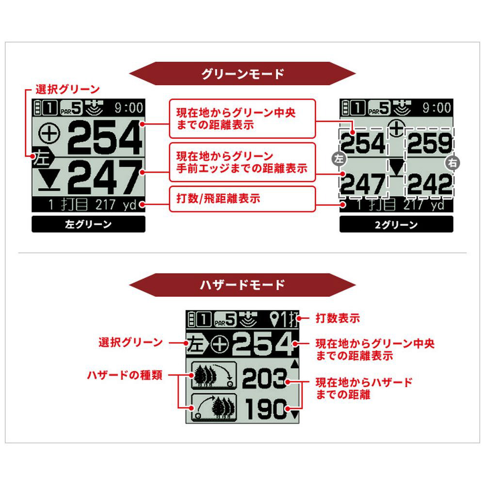 グリーンやハザードまでの距離を表示する2つのモードから選択が可能。