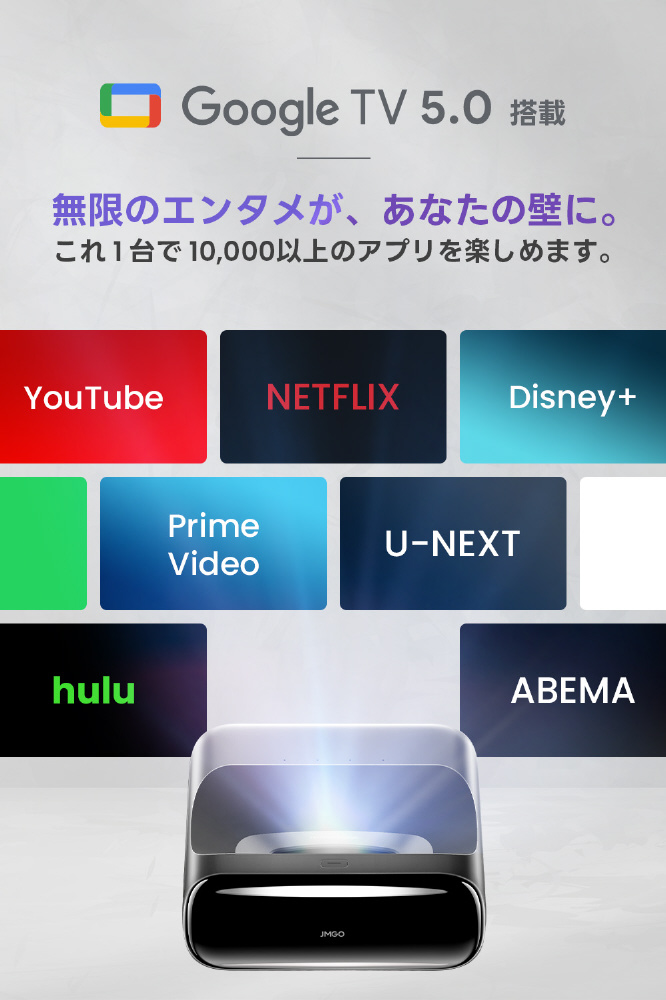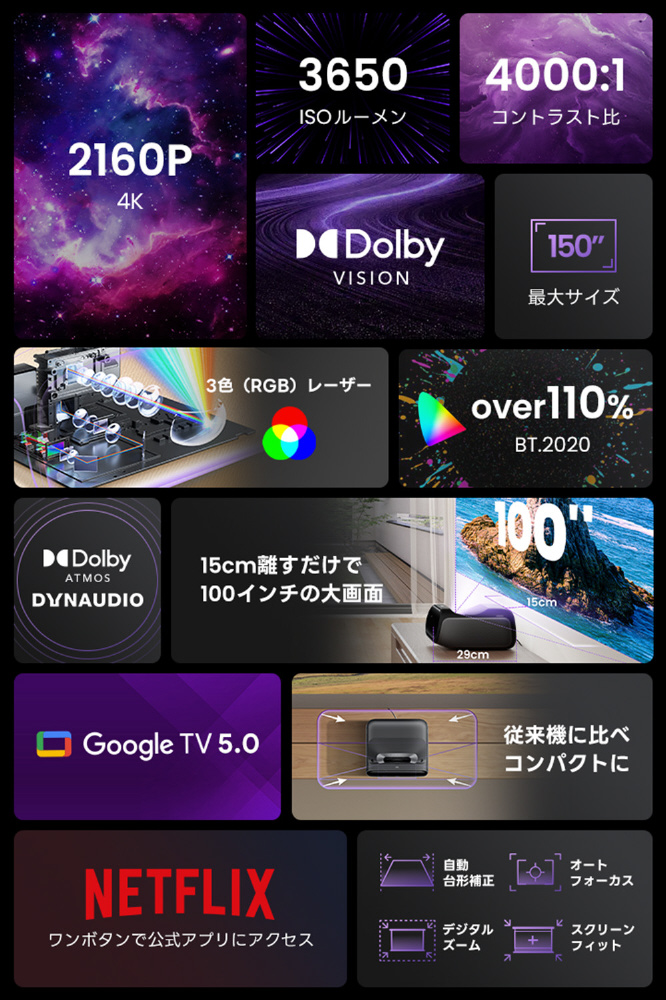 従来の超短焦点プロジェクターや長焦点プロジェクターが抱える課題を解決し、誰もが手軽に“本格シアター体験”を暮らしの中に取り入れられるよう設計されています。さらにGoogleTV 5.0を搭載のプロジェクターです。AI搭載により快適でストレスの少ない環境下で、スムーズな映像体験を実現します。
