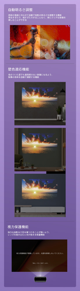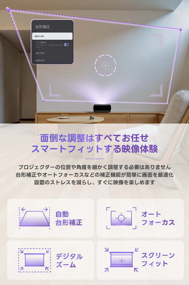 ・スマートフィットする映像体験、設置も楽々― 自動台形補正、オートフォーカス、自動スクリーンフィット、デジタルズーム搭載で、面倒な調整はすべて自動。最適な映像をすぐに楽しめます。