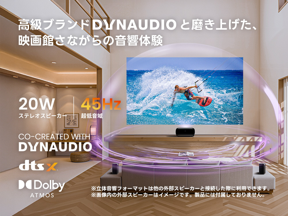 コンパクト設計と革新的技術により、暮らしの空間にすっきりフィット。リビングや寝室、ちょっとした棚の隙間に設置するだけで、迫力ある本格的ホームシアター楽しめます。