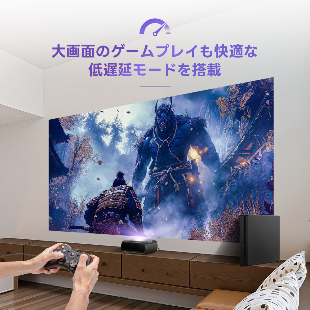・ 業界最短の投射比を実現。短い距離でも迫力ある大画面を投影でき、限られた日本の住空間にも最適。
