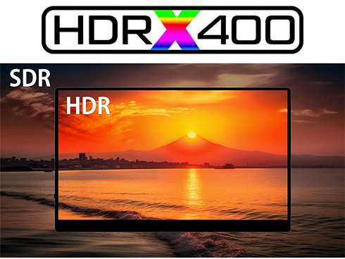 ■最大輝度400cd/m2、1200:1の高コントラスト比、sRGB:100%、DCI-P3:88%の広色域に対応した液晶パネルは、HDR400相当の性能を持ち、コンテンツを色鮮やかに映し出します。HDR(ハイダイナミックレンジ)に対応し、明るい部分も暗い部分もくっきり表現しリアルに迫った深みのある映像を演出します。