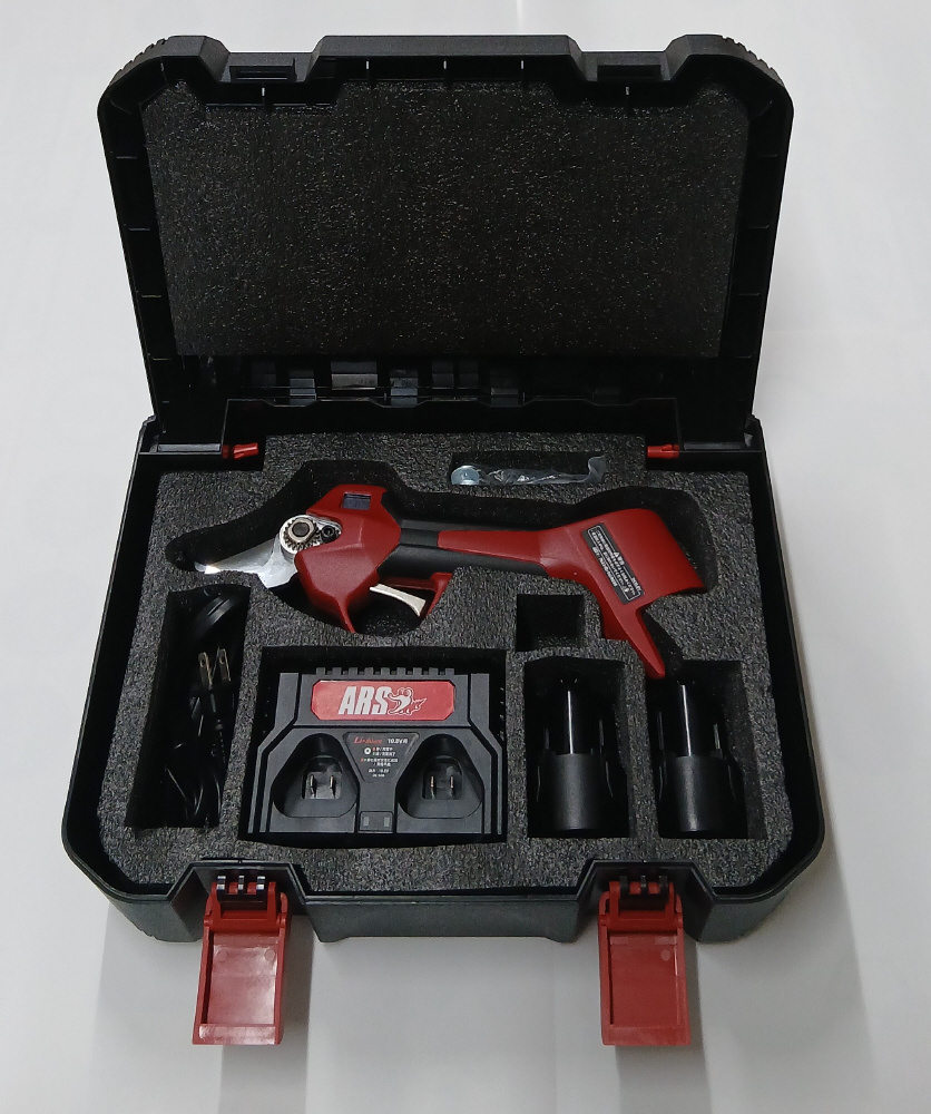 ●信頼の切れ味。●安心のサポート体制。●疲れにくい軽量設計。●はじめての電動剪定に、アルスの安心を。●剪定鋏を初めて電動に変えるなら、信頼できるものを。●スゴセンライトは「軽さ」「扱いやすさ」「安心サポート」の三拍子が揃った一本。●機能もアフターサービスも両方で安心して使用いただけます。●長時間作業でも疲れにくい、軽量設計。●重心バランスとグリップ設計で、誰の手にもなじみやすく、長時間の作業も快適にこなせる電動鋏です。●信頼の切れ味と、安心のサポート体制。●刃物メーカーならではの技術により、軽い力でスパッと切れる快適さ。●さらに「グリーンパパ」などの修理サービスで、長く安心してお使いいただけます。●園芸刃物メーカーとして培った剪定刃製造の技術を活かし、パワフルな電動式剪定鋏専用の「枝すべりを抑えつつ耐久性に優れた刃」を開発。●取り回し自在のコードレス&電動式で作業者の負担を軽減しつつ、快適な切れ味を実現しました。●刃元を鋭角、刃先をやや鈍角のグラデーション状にする特許取得の独自研磨を下刃に採用。●刃元が切断対象物に食い込み、太い枝も滑らずしっかり切断できます。●電動剪定鋏の強いパワーで切断しても刃欠けが起きにくいよう、手で使う剪定鋏よりも1段多い3段加工の刃を採用。●プロのハードな使用に耐えます。●細い枝をたくさん剪定するときは、刃の開き幅が狭い「細枝モード」に切り替え可能。●刃の開き幅が狭いと開閉速度が上がり、素早く切断できます。●安心の1年保証付きです。●木を傷つけず、健やかに育てる切れ味。●創業150年超の刃物づくりの知見と切れ味と耐久性を兼ね備えた3段加工刃により、木の癒合が早く、病気のリスクも減少。●より良く、より健やかに育てるための手助け。●木の繊維を潰さず、清潔で滑らか。●トリガー追従式で刃の開き幅が自由自在。●0.3秒でφ25mmの太枝切断 ※1サイクル0.6秒。●専用ホルスター付き。●丈夫な樹脂製キャリングケース。●替刃式。●切断目安:生木直径25mm(※切断径は樹木により変動します)。●刃長:52mm。●セット内容:本体・バッテリー×2・充電器・電源コード・替刃用2.5六角レンチ・替刃用4六角レンチ・替刃用14特殊レンチ・専用油差し・キャリングケース・取扱説明書・ユーザー登録案内書。●電圧:DC10.8V。●バッテリー容量(リチウムイオン電池):2.5Ah。●標準充電時間:1~2.5時間(1バッテリーあたり)。●連続使用時間:2.5~4.5時間(作業条件により変動)。●推奨使用環境:5度~45度、限界値:マイナス10度(※限界値は確実な動作を保証するものではありません)。●充電環境:5度~45度(※特に、寒い環境での充電は避けてください)。