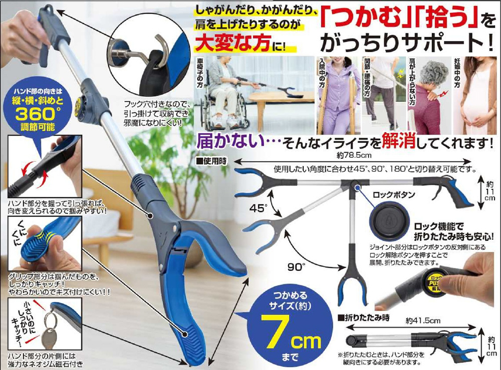 しゃがんだり、かがんだり、肩を上げたりするのが大変な方に!折りたためる上引っ掛けられるので、車椅子の方にもおすすめです。
