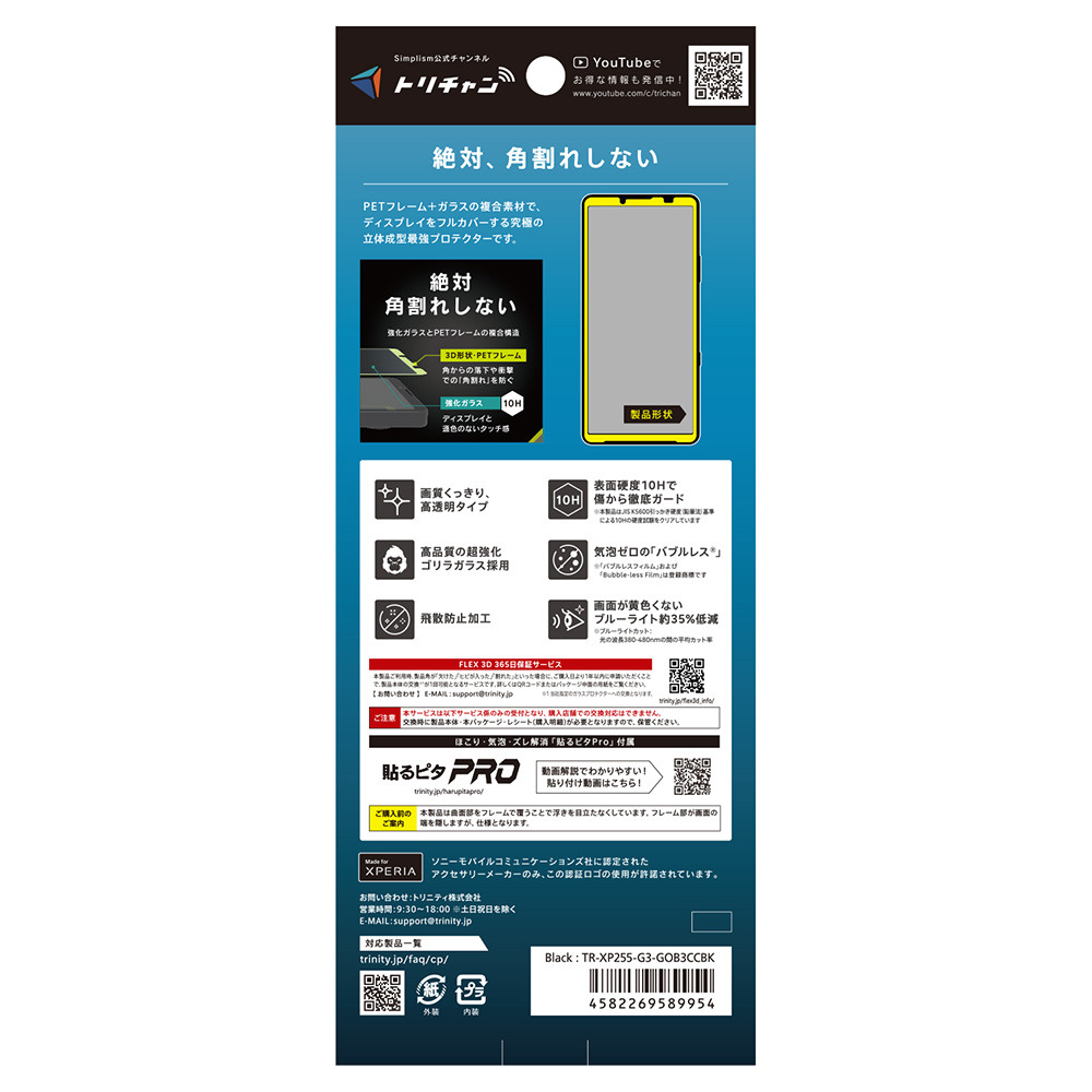 しなやかで割れにくい、高品質のゴリラガラスを採用。PETフレーム+ガラスの複合素材で、ディスプレイをフルカバーする究極の立体成型最強プロテクターです。