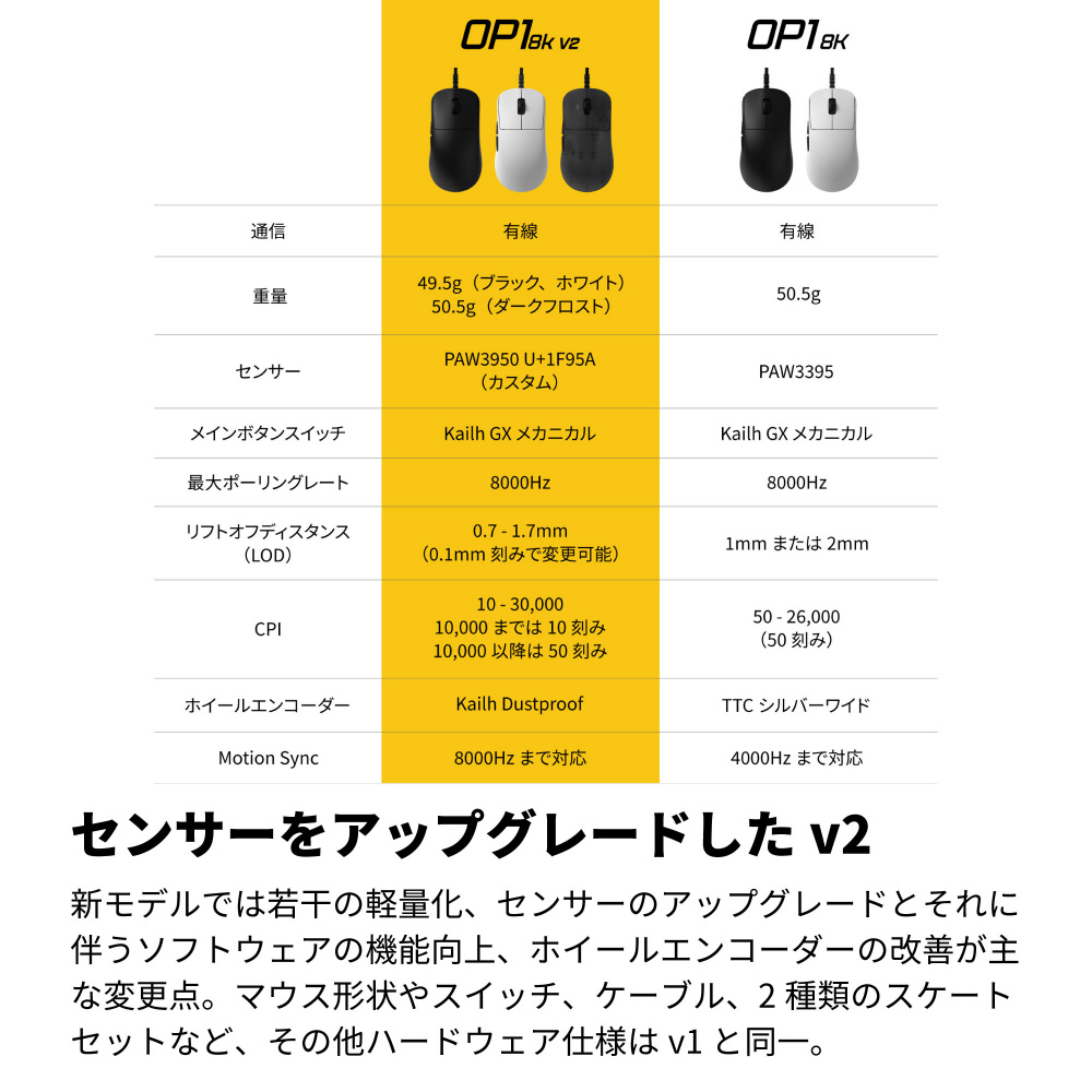 「OP1 8K v2」は、有線・8000Hzポーリングレート対応のゲーミングマウス「OP1 8K」の後継モデル。新しいカスタムセンサー、業界随一の低遅延クリック、メインボタンのホットスワップ機構を搭載し、独自のポジションでゲーミングマウスを再定義する。