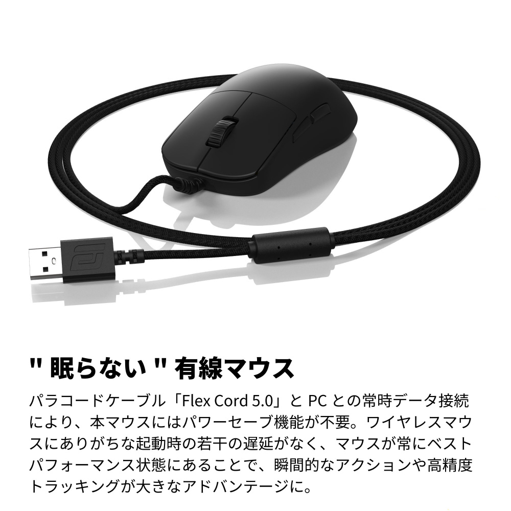 パラコードケーブル「Flex Cord 5.0」とPCとの常時データ接続により、本マウスにはパワーセーブ機能が不要。