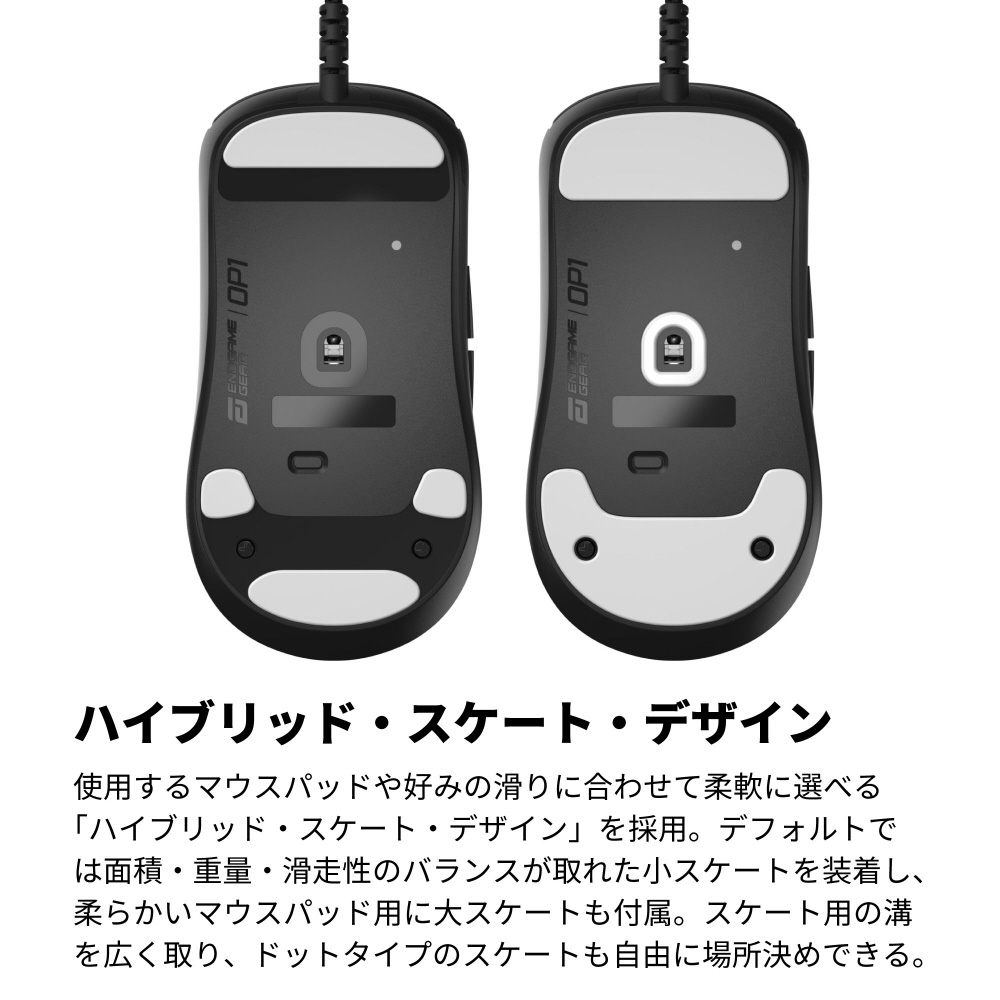 使用するマウスパッドや好みの滑りに合わせて柔軟に選べる「ハイブリッド・スケート・デザイン」を採用。