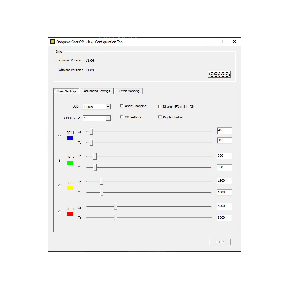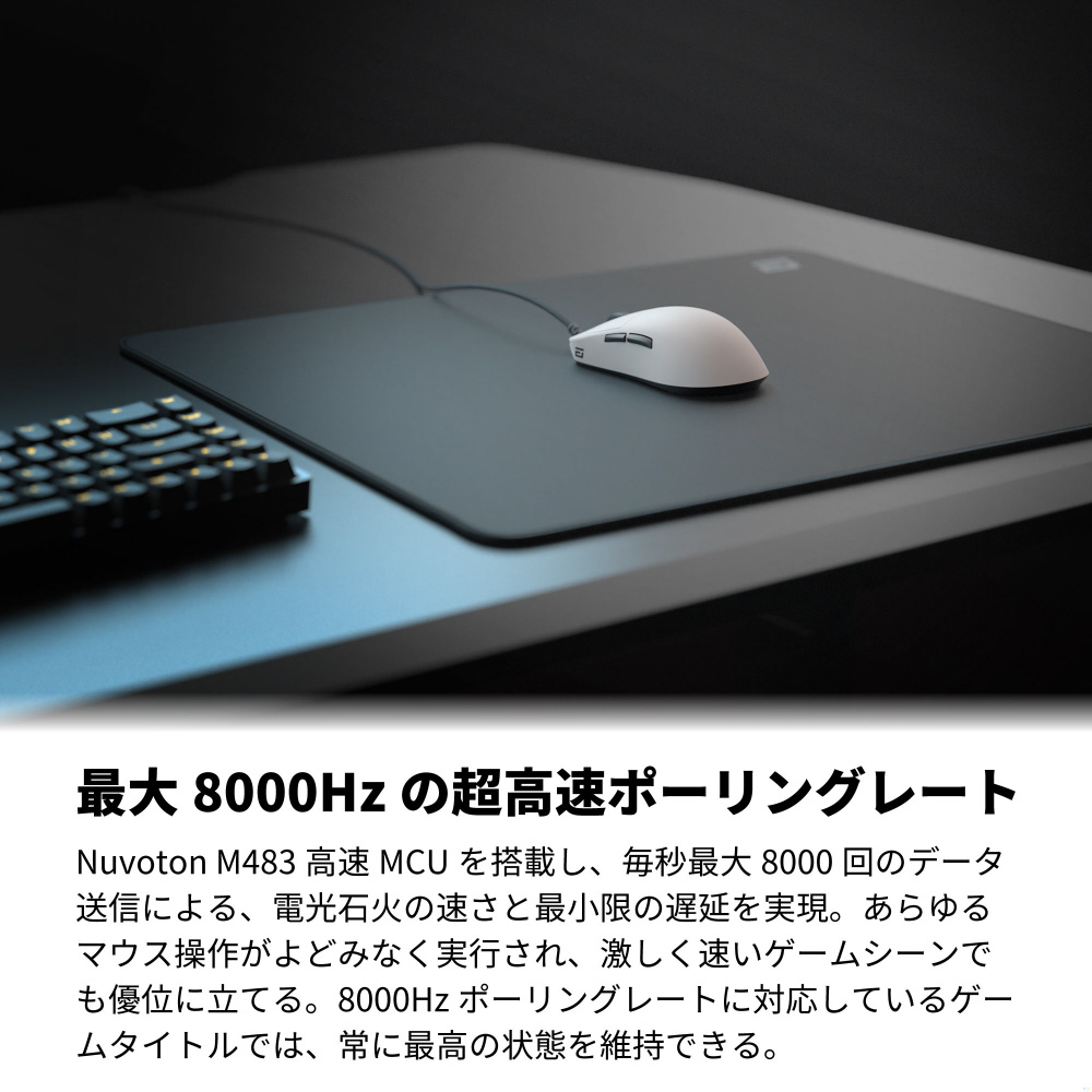 Endgame Gear専用にカスタムした新センサー、PAW3950 U+1F95Aを搭載。CPIやトラッキング速度などスペック面での向上に加え、リフトオフディスタンスは0.7〜1.7mm内で0.1ミリ単位で選択、CPIは10000までなら10刻みで調整可能に。