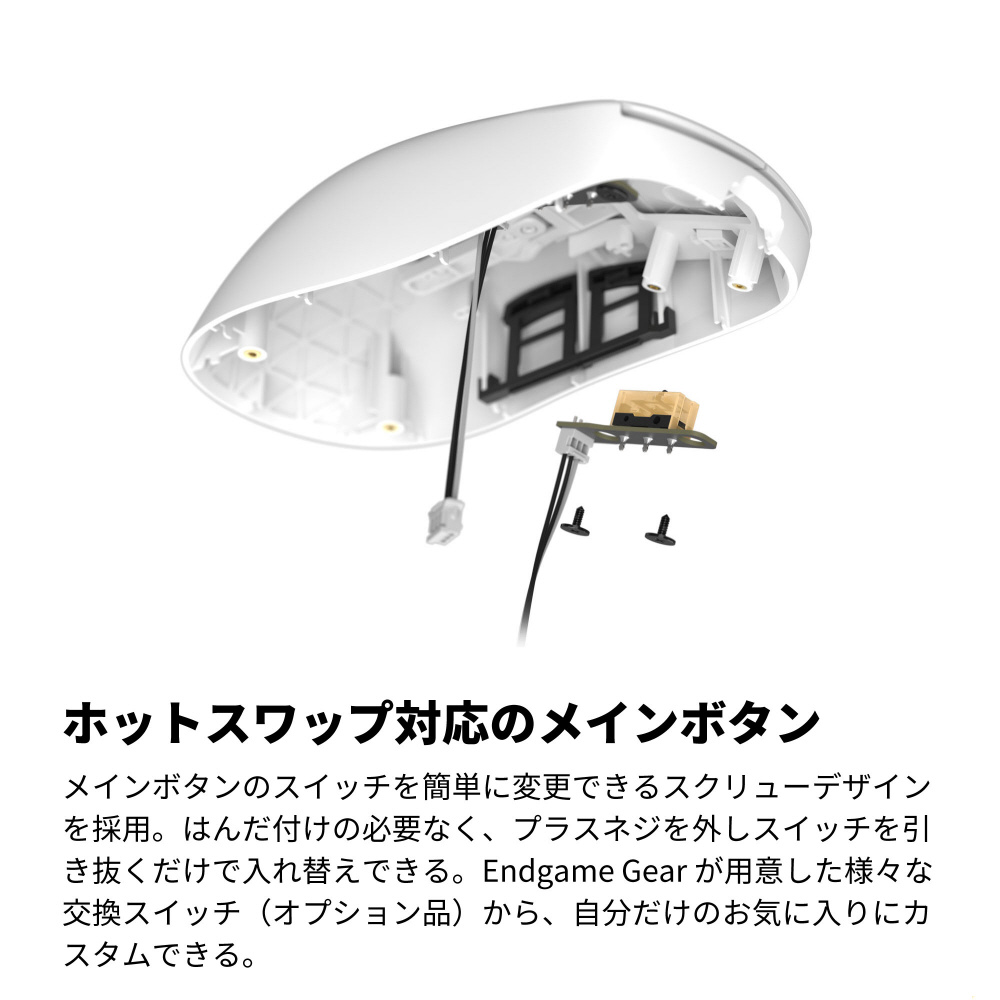 Endgame Gear が用意した様々な交換スイッチ(オプション品)から、自分だけのお気に入りにカスタムできる。
