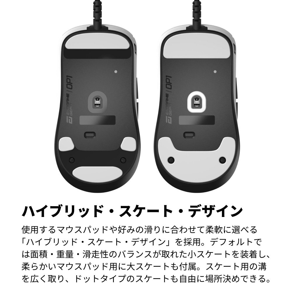 使用するマウスパッドや好みの滑りに合わせて柔軟に選べる「ハイブリッド・スケート・デザイン」を採用。