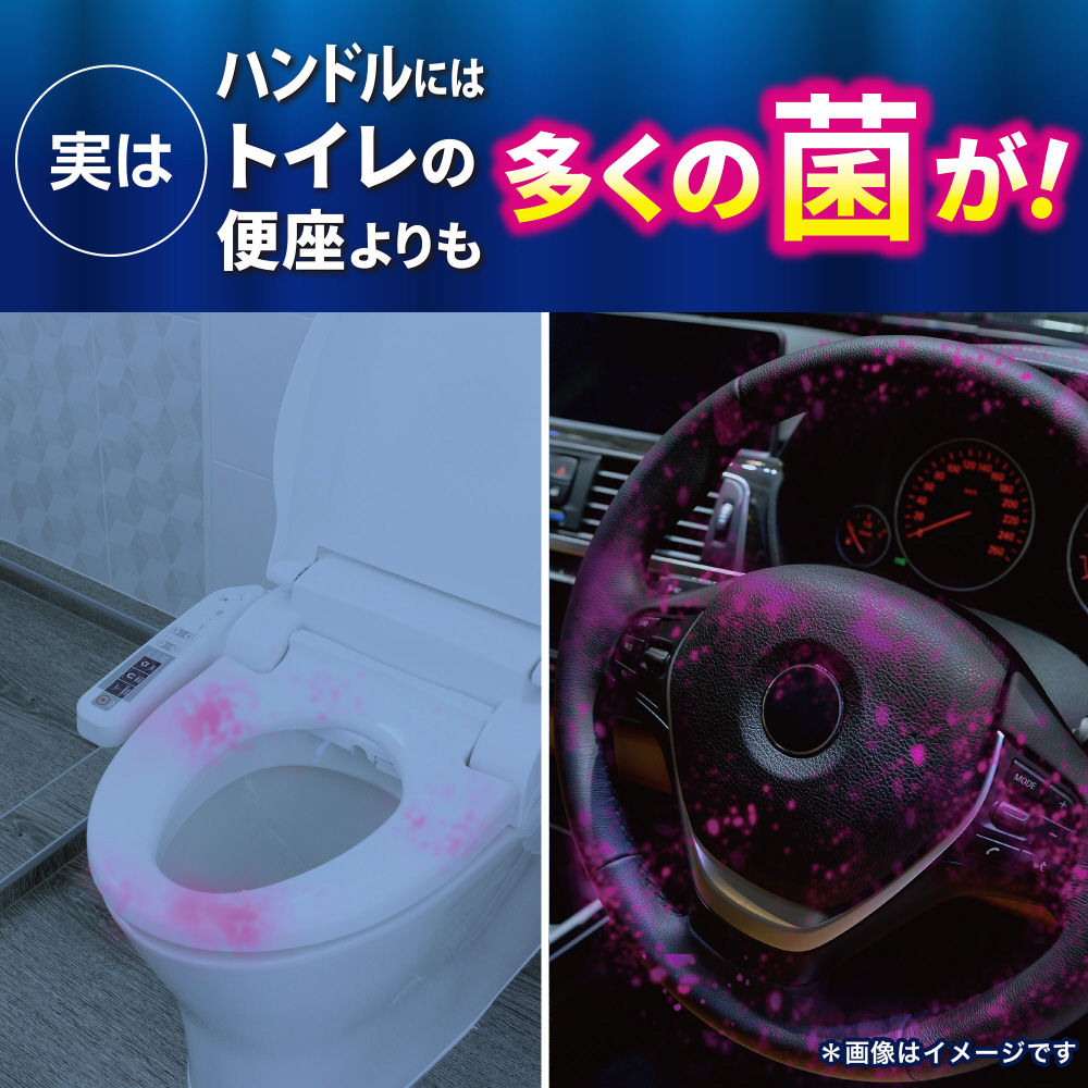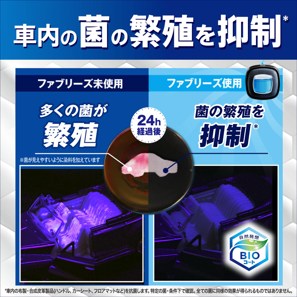 ^車内の布製・合成皮革製品(ハンドル、カーシート、フロアマットなど)を抗菌します。特定の菌・条件下で試験。全ての菌に同様の効果が得られるものではありません。 車用消臭芳香剤