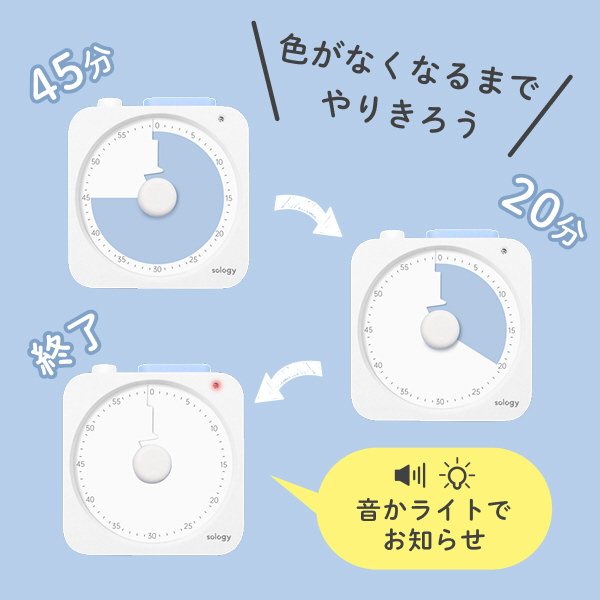 「あと何分?」を色の変化でお知らせ。残り時間を視覚的に把握できることで、「もう少し頑張ろう」という前向きな気持ちを後押しします。