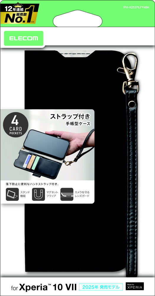 4つのカードポケットを備えた、ハンドストラップ付きのソフトレザーケースです。端末装着部分に衝撃を吸収するTPU(熱可塑性ポリウレタン)素材を使用し、端末を衝撃から守ります。落下時に最も大きな衝撃が予想される四つ角にエアークッションを設置し、効率的に衝撃を吸収します。マグネット付きフラップなので、ワンタッチで簡単に開け閉め可能です。フラップの内側に、メモやカードなどが収納できるポケットが4つ付いています。