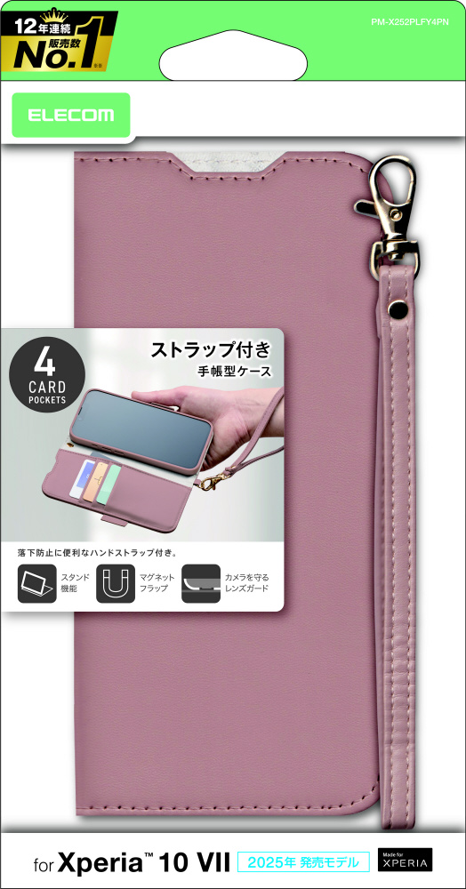 4つのカードポケットを備えた、ハンドストラップ付きのソフトレザーケースです。端末装着部分に衝撃を吸収するTPU(熱可塑性ポリウレタン)素材を使用し、端末を衝撃から守ります。落下時に最も大きな衝撃が予想される四つ角にエアークッションを設置し、効率的に衝撃を吸収します。マグネット付きフラップなので、ワンタッチで簡単に開け閉め可能です。フラップの内側に、メモやカードなどが収納できるポケットが4つ付いています。