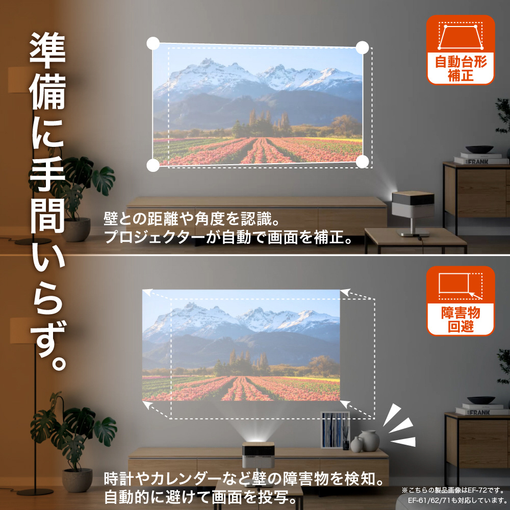 「自動台形補正」や「障害物回避」などの便利な機能を搭載し、壁との距離や角度を認識して画面を自動で調整。細かな設定なしで、手軽に4K相当の美しい映像を楽しめます。