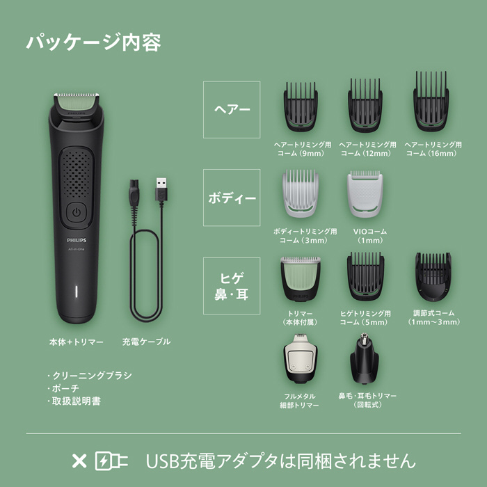 本製品には10種類〜12種類のアタッチメントが付属しており、ヘアーカットからヒゲのお手入れ、身体のムダ毛処理など、さまざまな用途に対応します。