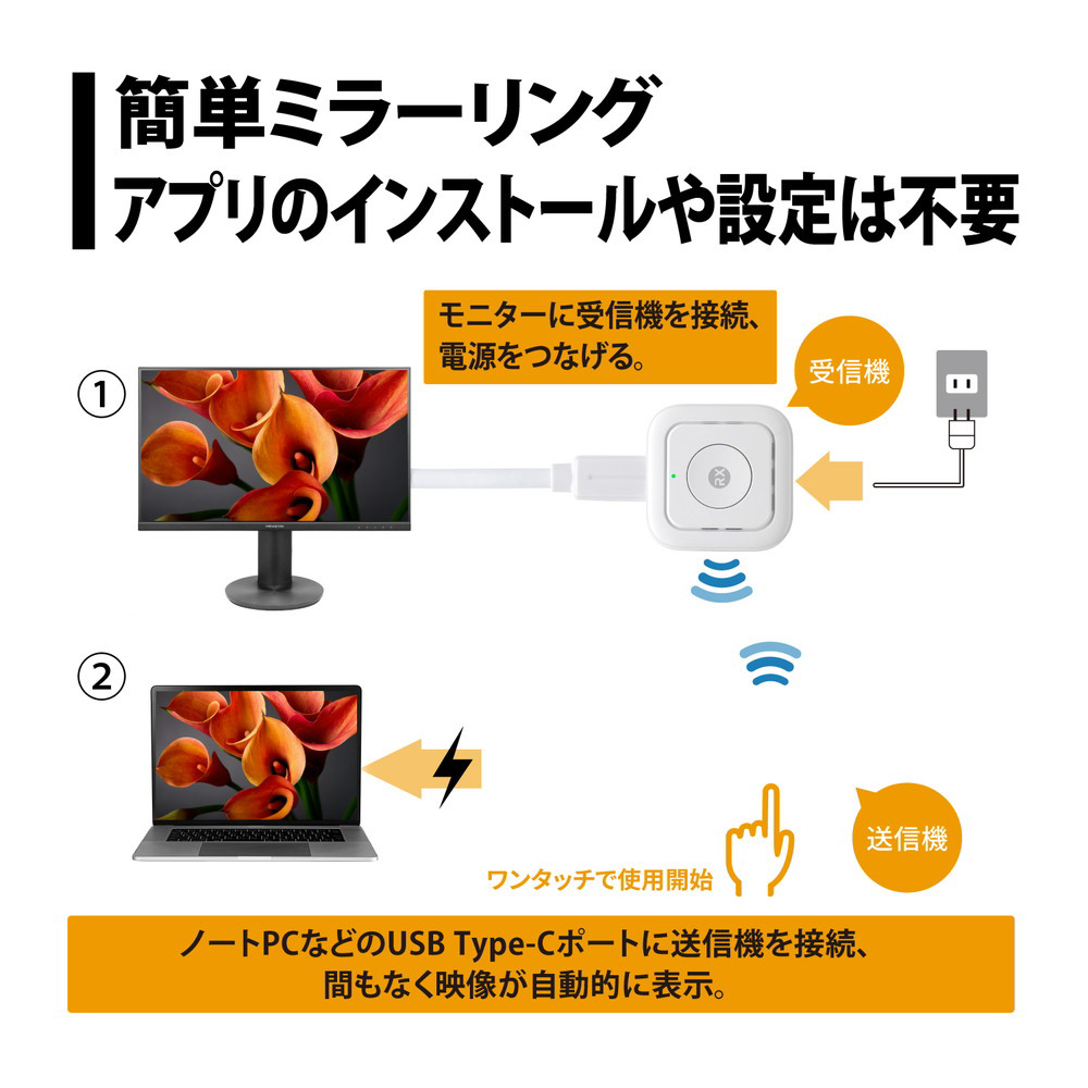 ※本製品は送信機がType-C接続で受信機がHDMI接続の製品です。送信機側の機器はDisplayPort Alt Modeに対応している必要があります。送信機・受信機ともにHDMI接続になっているタイプもございます。ともにHDMI接続製品は「SP Cast Pocket Mini(ワイヤレスHDMI to HDMI)」をご参照ください。