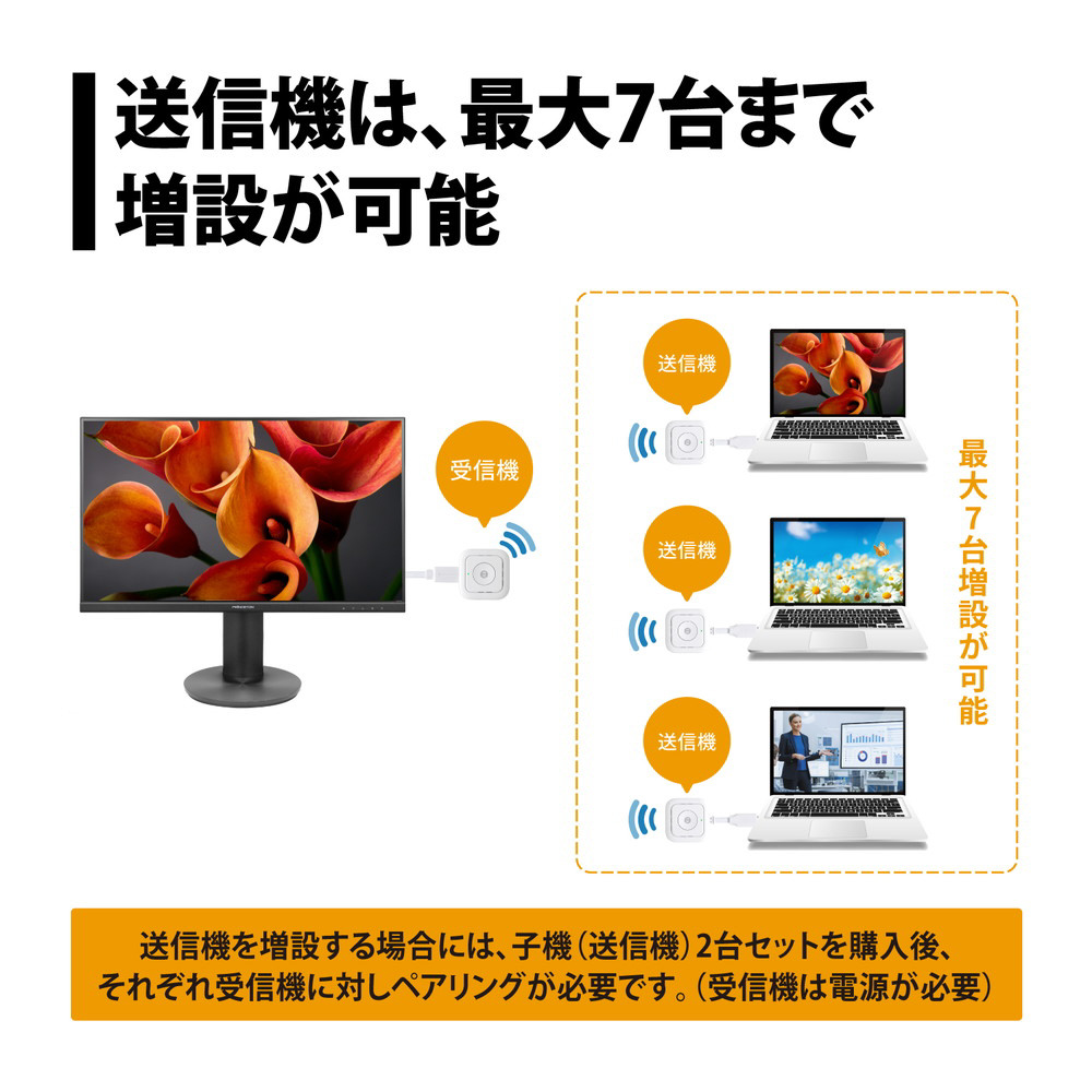 ※1 送信機を増設する場合は子機(送信機)2台セットを購入後、それぞれ受信機(RX)に対してペアリングが必要です。また、子機(送信機)についてはHDMI接続タイプとUSB Type-C接続タイプどちらでも増設が可能です。