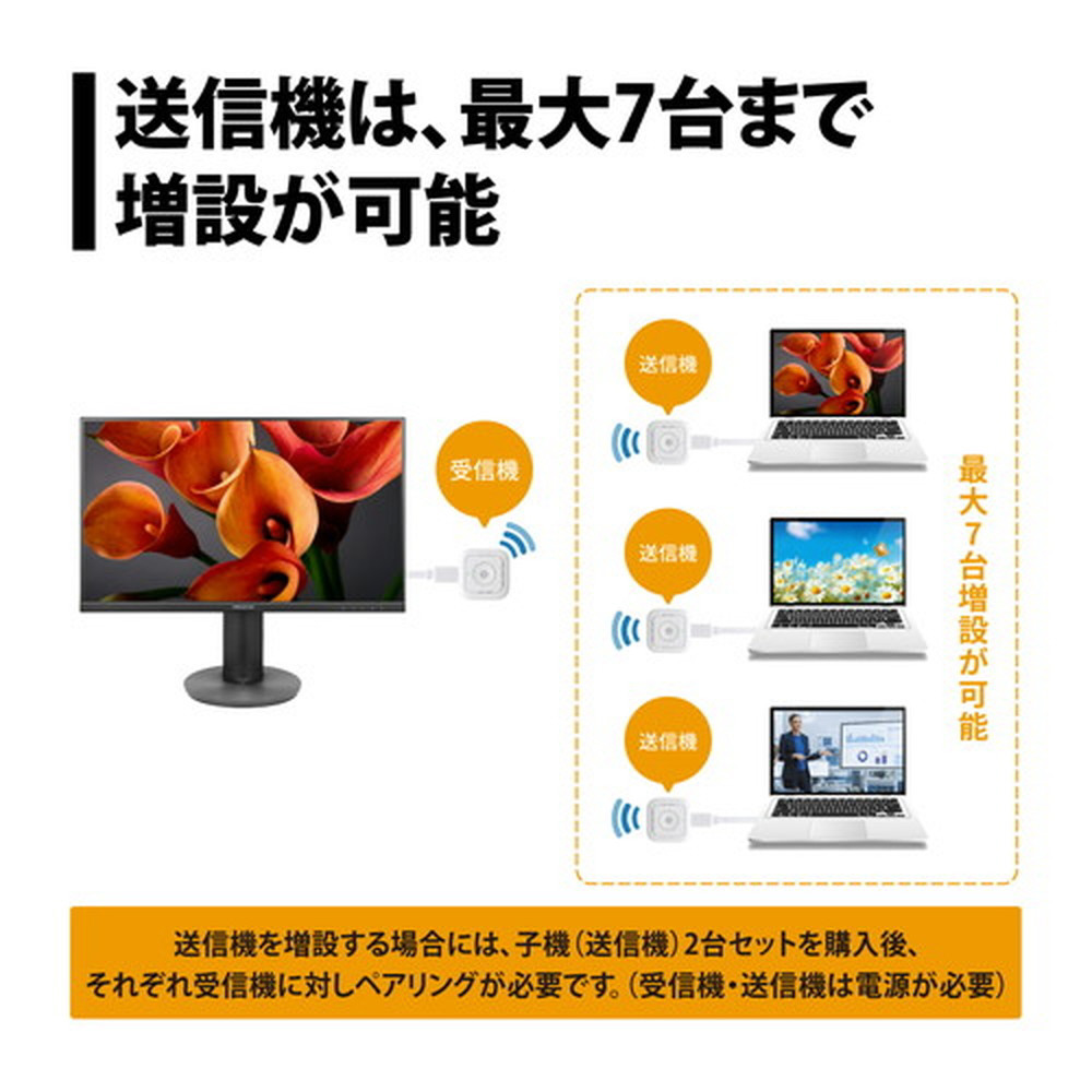 ※1 送信機を増設する場合は子機(送信機)2台セットを購入後、それぞれ受信機(RX)に対してペアリングが必要です。また、子機(送信機)についてはHDMI接続タイプとUSB Type-C接続タイプどちらでも増設が可能です。