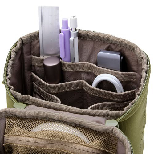 ペンやケーブルをまとめて収納できるファスナー開閉式のメッシュポケットを備えています。