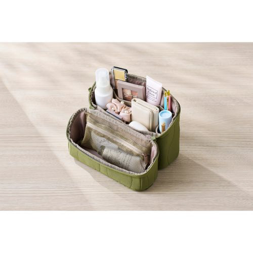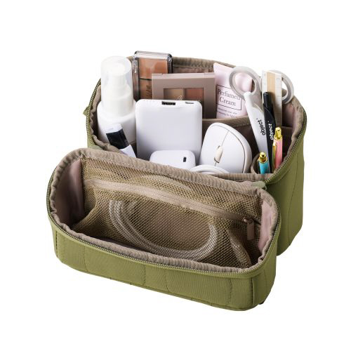 デスク周りの小物やガジェット、筆記用具などのワークツールをまとめてスッキリ収納!たっぷり入る大容量タイプで、デスク上で道具入れとして使える、スタンドタイプのツールポーチです。持ち運びに便利なハンドル付き。上品な光沢のあるオニオンステッチのキルティング素材を採用した、大人カジュアルなデザインです。