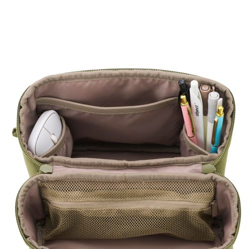 ペンやケーブルをまとめて収納できるファスナー開閉式のメッシュポケットを備えています。