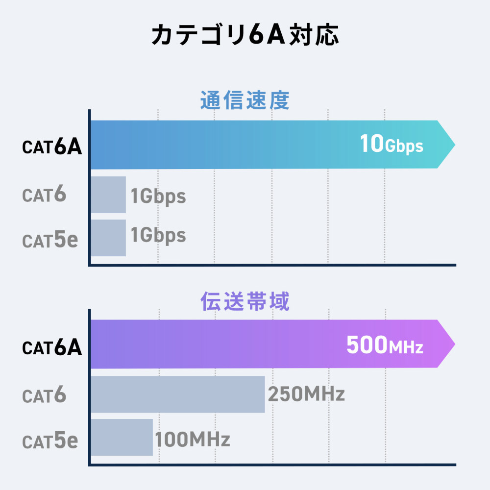 [対応カテゴリ規格]カテゴリ6A(10GBASE-T)、カテゴリ6(1000BASE-TX)、カテゴリ5e(1000BASE-T)、カテゴリ5(100BASE-TX)、カテゴリ3(10BASE-T)適合