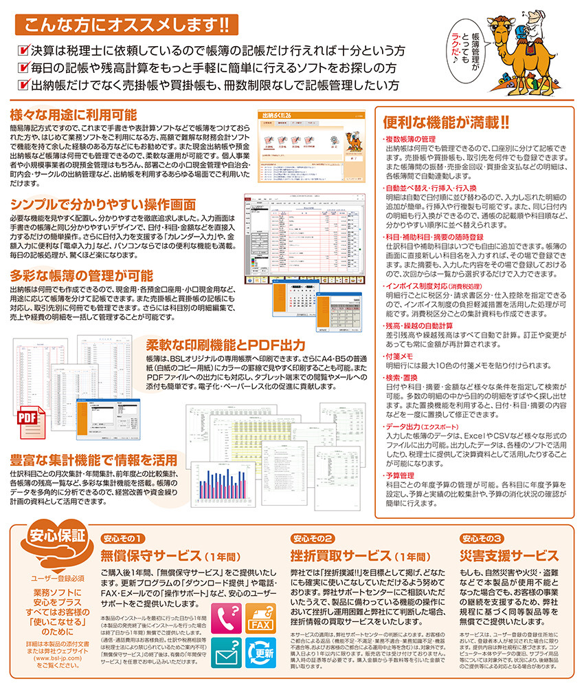 会計ソフトよりも気軽に記帳ができる出納帳ソフト。帳簿数の制限はありません。売掛帳や買掛帳も作れます。各種集計表も用意しています。