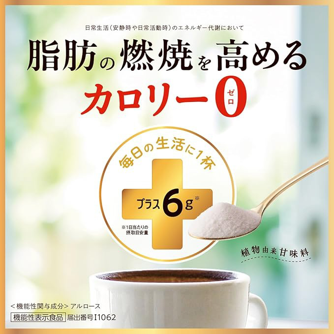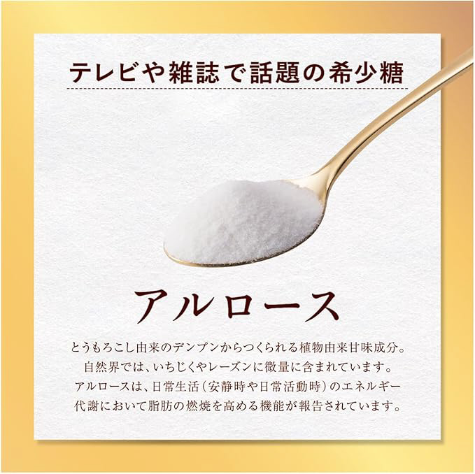 機能性関与成分アルロース。日常生活(安静時や日常可動時)のエネルギー代謝において、脂肪の燃焼を高める。食後血糖値の上昇をおだやかにする。