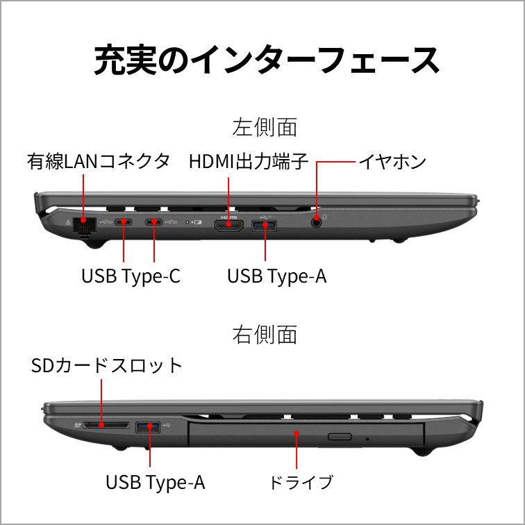 [ダイレクト・メモリースロット]SDメモリーカード対応x1 [USB-C] USB4(Gen3)x1 USB 3.2(Gen2)x1(USB Power Delivery対応、DisplayPort Alt Mode対応) [USB-A] USB 3.2(Gen1)x1 USB 3.2(Gen2)x1 [映像入出力]HDMI出力端子x1 [LAN]RJ-45x1 [オーディオ]マイク・ラインイン・ヘッドホン・ラインアウト・ヘッドセット兼用端子x1(φ3.5mmステレオ・ミニジャック)