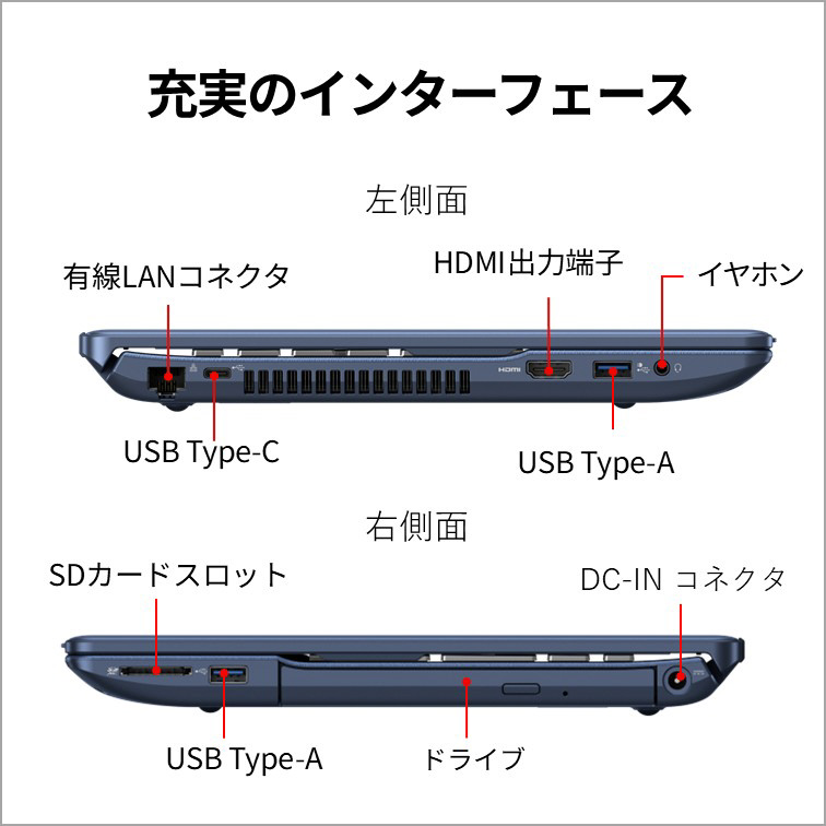 [ダイレクト・メモリースロット]SDメモリーカード対応x1 [USB-C] USB 3.2(Gen2)x1 [USB-A] USB 3.2(Gen1)x1 USB 3.2(Gen1)x1(電源オフUSB充電機能付) [映像入出力]HDMI出力端子x1 [LAN]RJ-45x1 [オーディオ]マイク・ラインイン・ヘッドホン・ラインアウト・ヘッドセット兼用端子x1(φ3.5mmステレオ・ミニジャック)